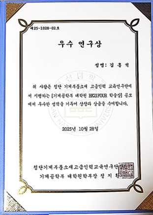 우리 연구실의 김홍석 박사과정생이 최근 1년간(2024.09.01~2025.08.31) 4편의 주저자 논문실적 및 학술대회 활동으로 2025 기계공학부 대학원 학술상 우수상을 수상하였습니다.